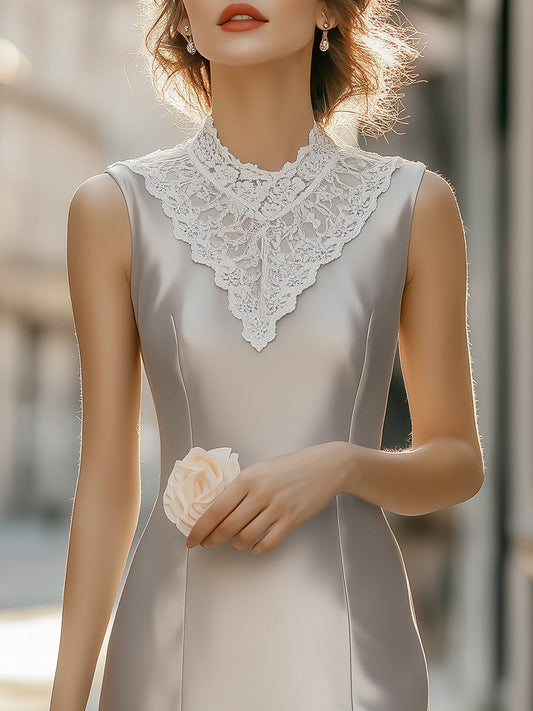 Elegant Satin Sleeveless Mini Dress With Vintage Lace Collar