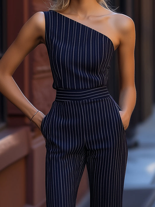 One-Shoulder Black Pinstripe Wide-Leg Jumpsuit