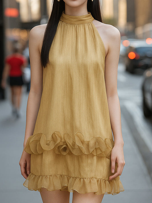 Sleeveless Beige Fit-and-Flare Dress With Contrast Ruffle Hem