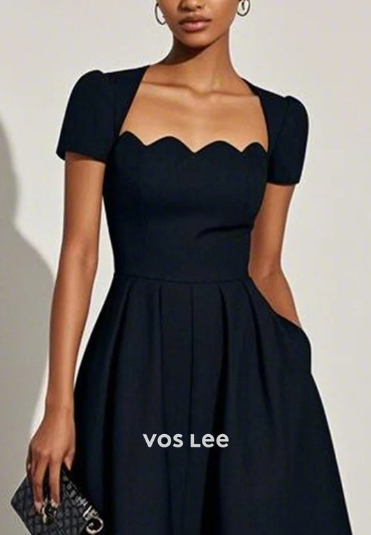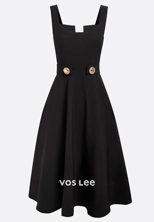 Luxurious Black A-Line Square Sleeveless Pleated Tea-Length Wedding Guest Dresses
