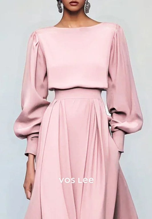 A-Line Long Sleeve Scoop Ankle-Length Pleated Empire Waist Wedding Guest Dresses
