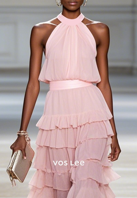 A-Line High Low Halter Ankle-Length Tiered Wedding Guest Dresses Party Dresses