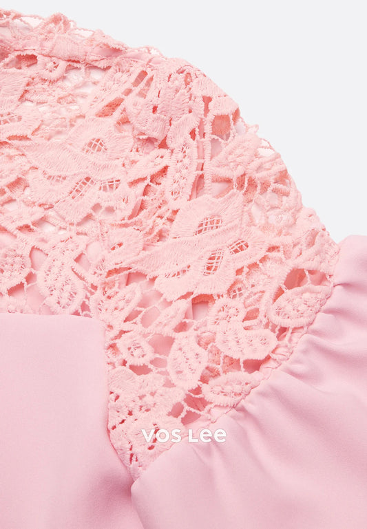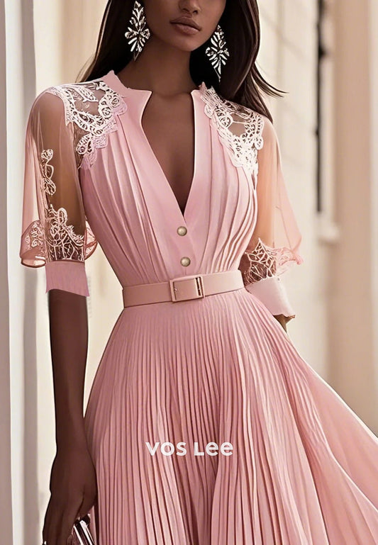 Pink Short Sleeve Pleated Lace V Neck A-Line Tea-Length Midi Chiffon Wedding Guest Dresses