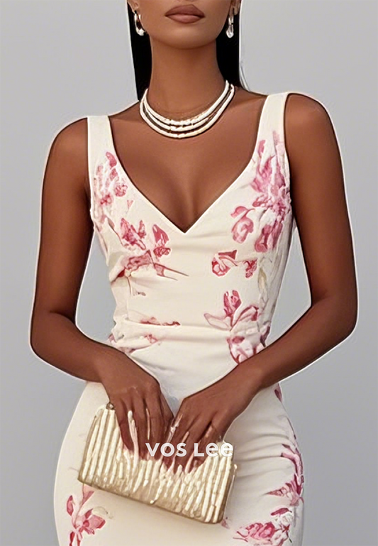 Regular Straps V Neck Flowers Sheath Ankle-Length Wedding Guest Dresses with Split