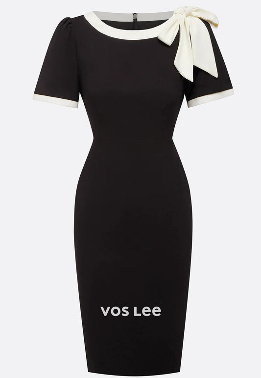 Short Sleeve Scoop Ruched Bowknot Knee-Length Sheath Wedding Guest Dresses