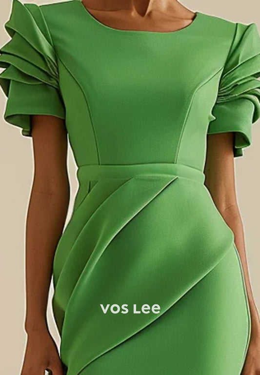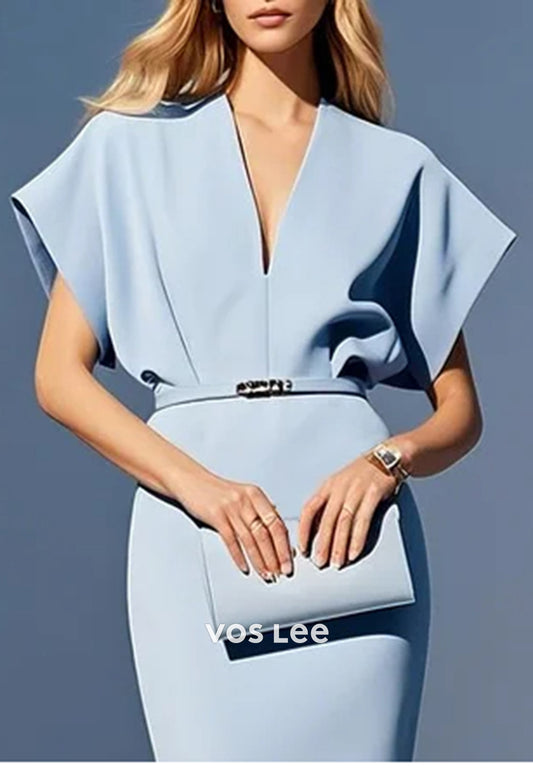 Short Sleeve V Neck Pleated Sheath Knee-Length Evening Dresses Party Dresses with Split