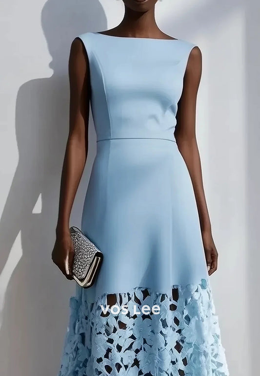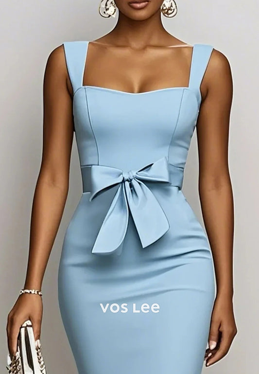 Sky Blue Sweetheart Bowknot Tea-Length Lace Mermaid Wedding Guest Dresses