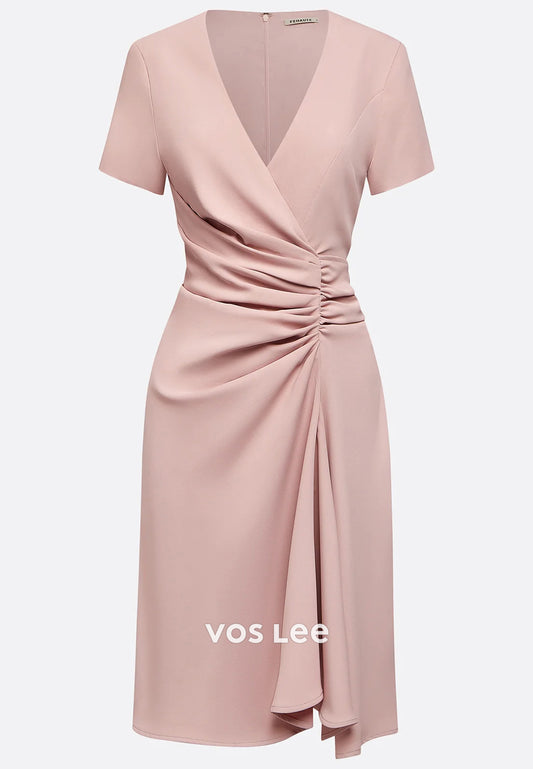 Short Sleeve V Neck Knee-Length Pleated Sheath Wedding Guest Dresses with Side Split