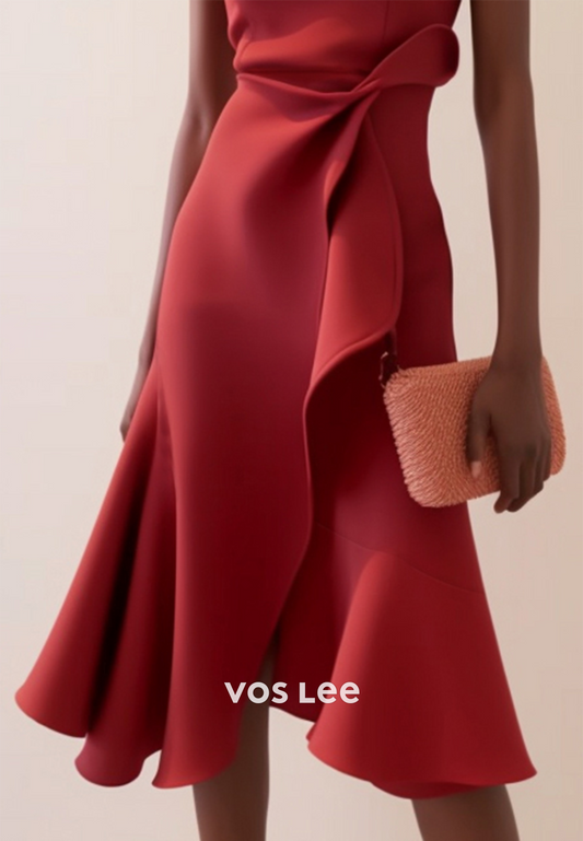 Classic & Simple Red Scoop Sheath Pleated Party Dresses with Asymmetrical Split