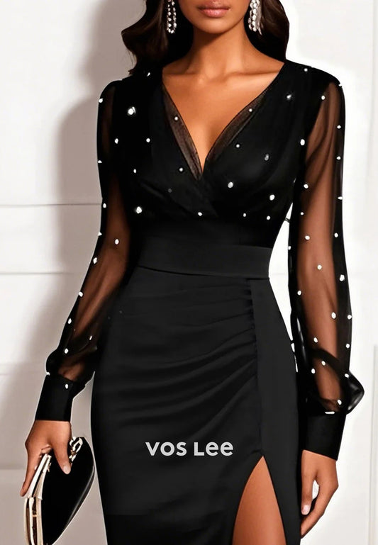 Long Sleeve V Neck Tulle Pleated Sheath Wedding Guest Dresses with High Split
