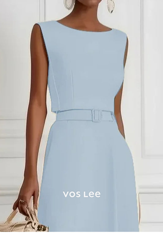 Sky Blue A-Line Empire Waist Scoop Tea-Length Wedding Guest Dresses