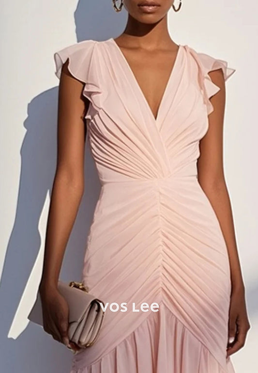 Sexy & Sleek Regular Straps V Neck Pleated Tea-Length Mermaid Wedding Guest Dresses