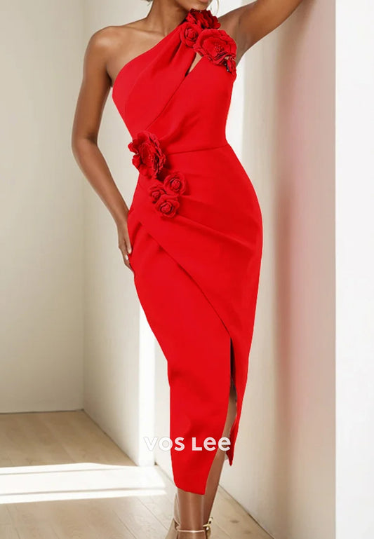 One Shoulder Floral Embellished Pleated Tea-Length Sheath Party Dresses with Split