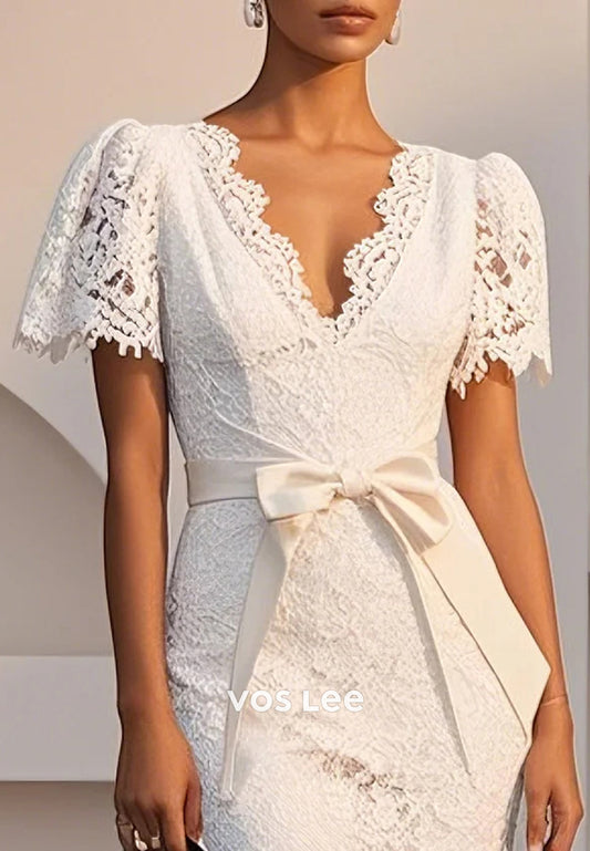 Short Sleeve White Bowknot Fully Lace V Neck Tea-Length Sheath Midi Party Dresses