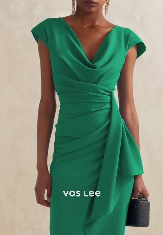 Classic Cap Straps V Neck Sheath Pleated Tea-Length Wedding Guest Dresses