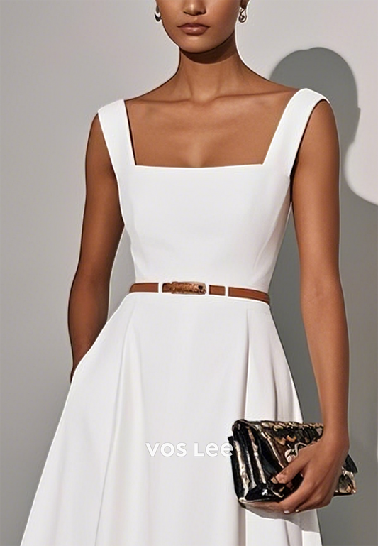 A-Line Illusion Cutout Lace Square Pleated Ankle-Length Wedding Guest Dresses