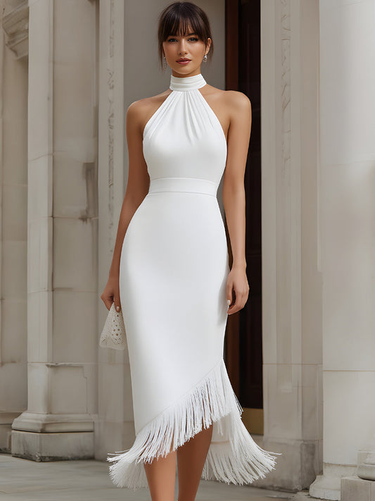 Glamorous White Halter Neck Midi Dress With Fringe Hem