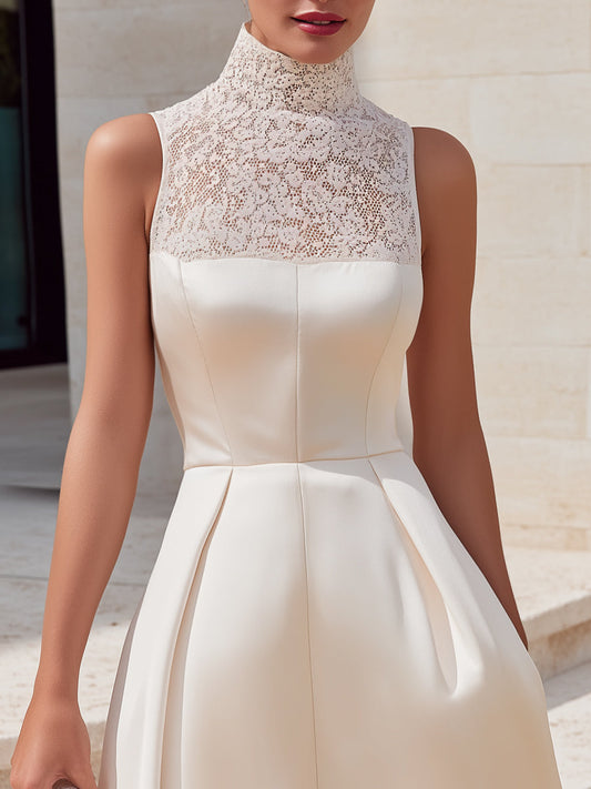 High-Neck Lace Bodice A-Line Midi Dress