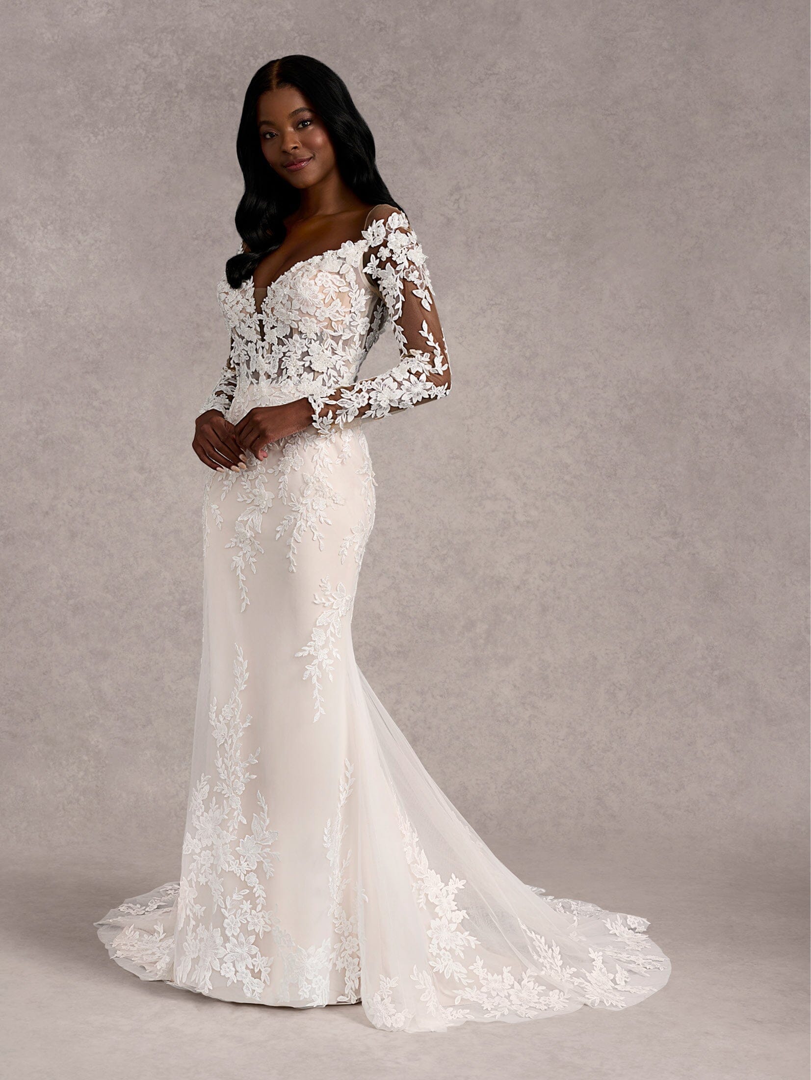 Decadent lace takes center stage on this column gown featuring a plunging sweetheart neckline with an illusion inset, off-the-shoulder illusion detail with long sleeves. A semi sheer bodice is adorned with sequin and three-dimensional lace appliqués that trail past the natural waist and continues on the skirt and at the hem border. The back bodice dips into a deep V that leads to cover buttons and a sweeping train.