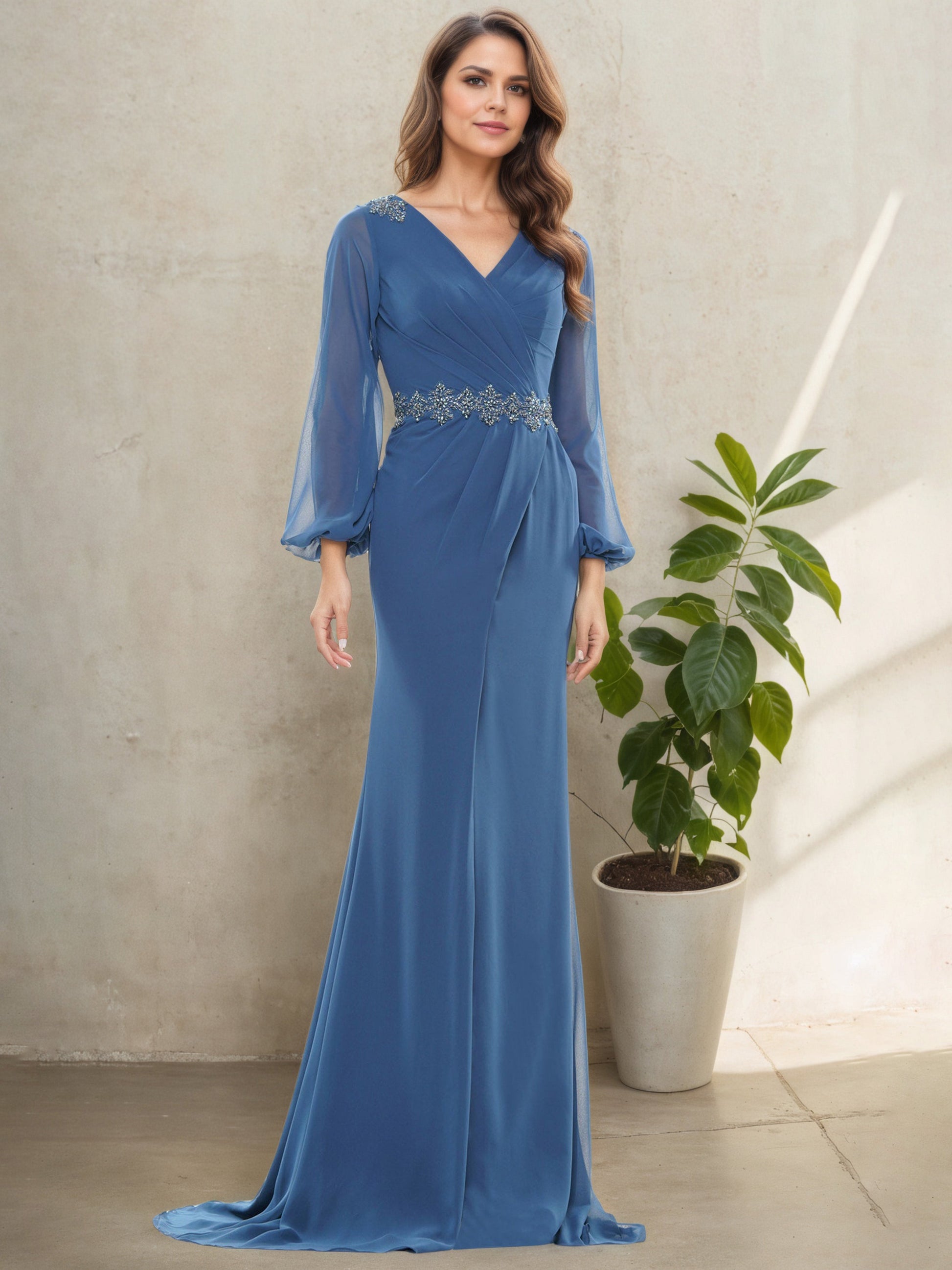 Lantern Sleeve Pleats Wedgewood V-Neck Mother Of The Bride Dress with Beading