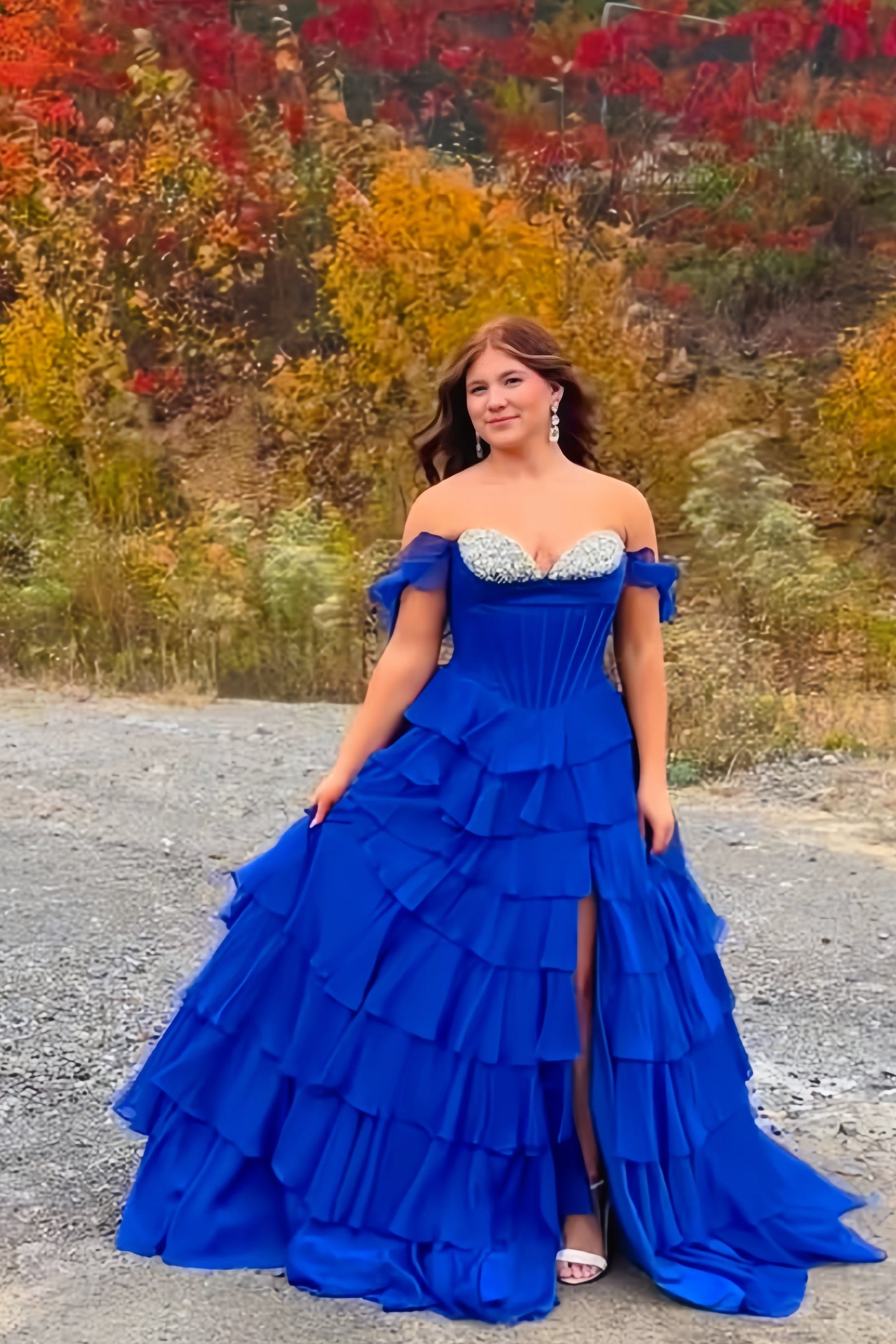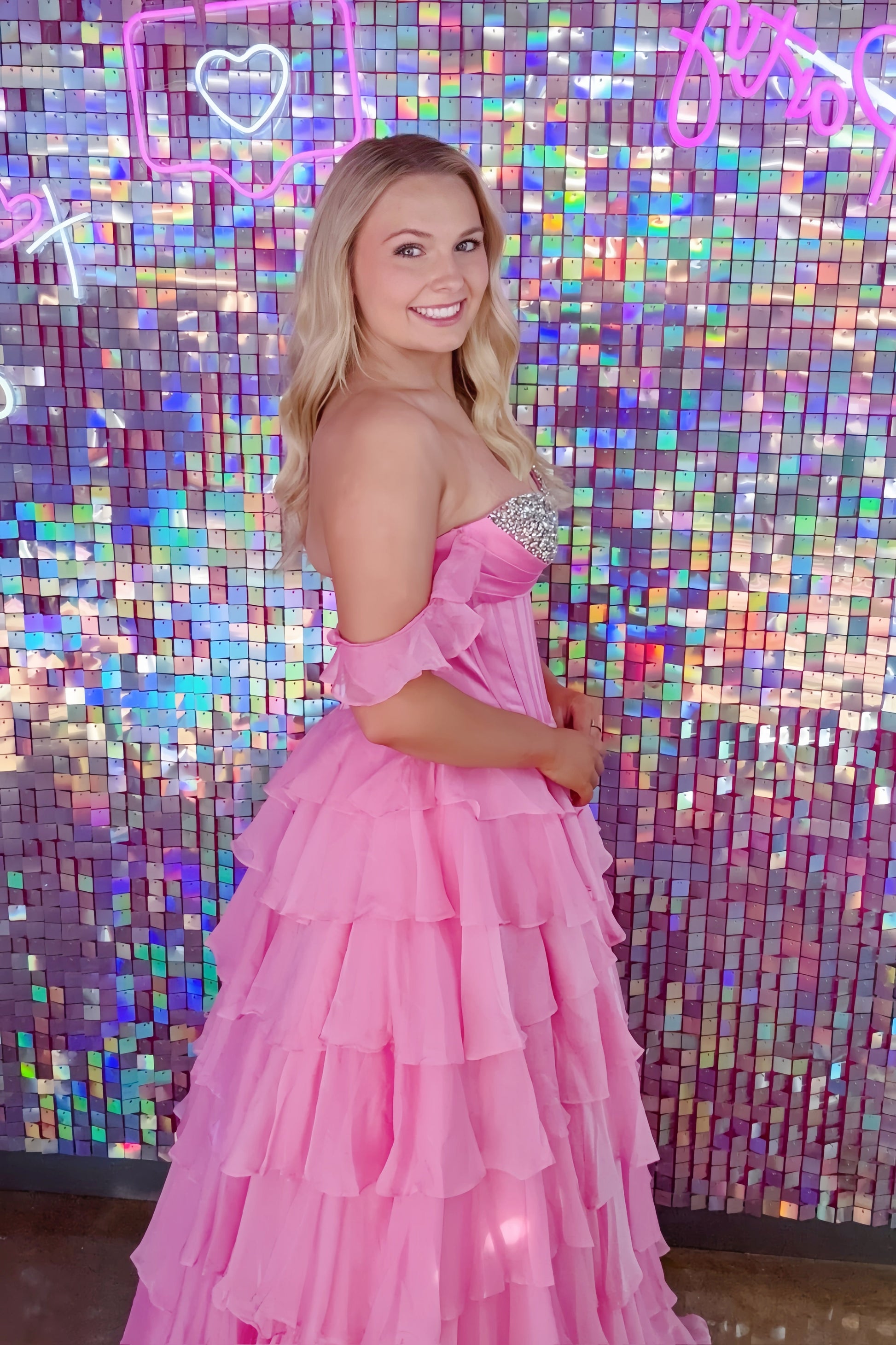 Crafted from chiffon fabric in a soft pink hue, this A-line gown features a beaded sweetheart neckline and off-shoulder design. It showcases a tiered ruffle hem, a full-length silhouette, and a low back for an elegant finish.
