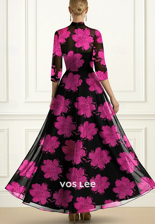 Semi Formal 3_4 Length Sleeve with Floral Print A-Line Evening Dress