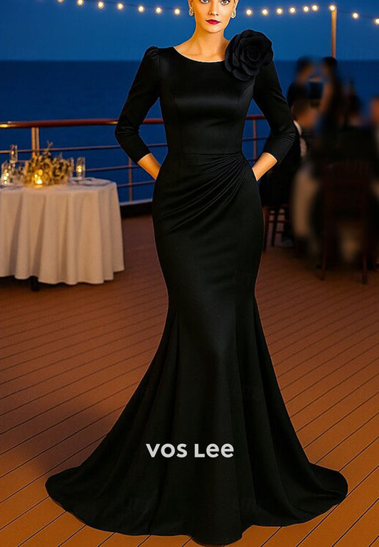 3/4 Sleeve Scoop Pleated Long Mermaid Mother of Bride Dresses with Sweep Train