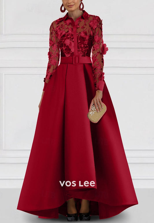Long Sleeve Shirt Collar Satin Lace with Embroideryg A-Line Floor Length Formal Dress