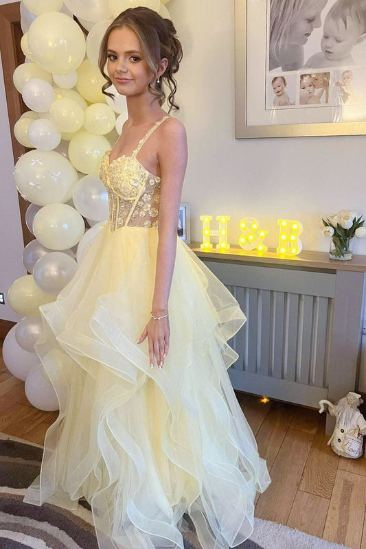 Yellow A Line Casual Prom Dresses Chiffon Wedding Guest Dress with Slit