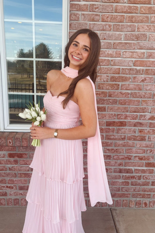 Strapless Pink Chiffon Pleated Ruffle Maxi Dress