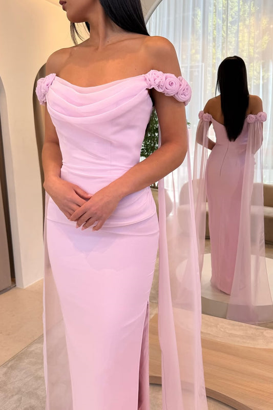 Off-the-Shoulder Tulle Ruffle Evening Dresses Sheath With Side Split Flowers