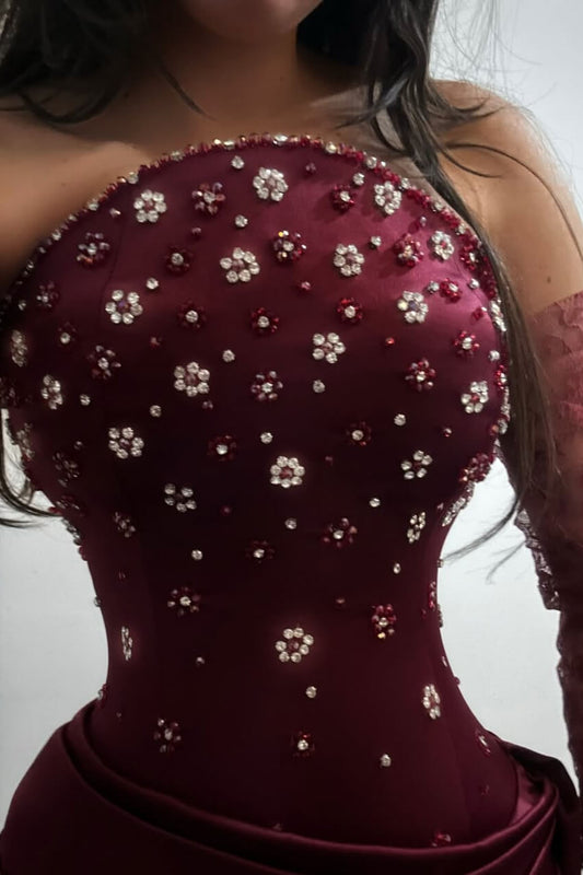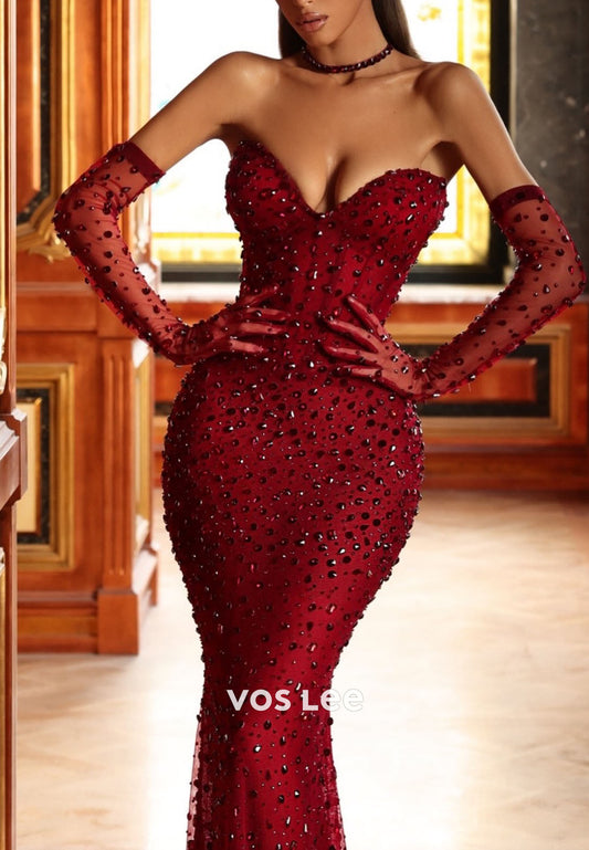 Burgundy Strapless Mermaid Long Evening Gowns Sleeveless With Beads