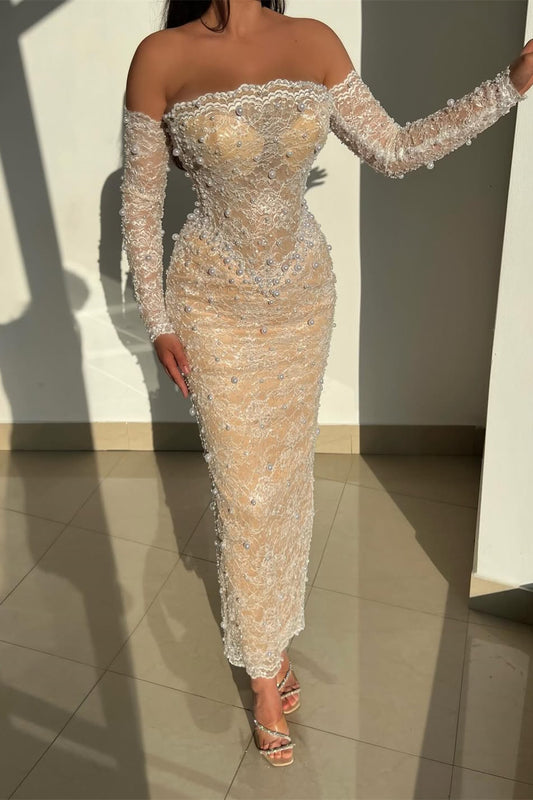 Off-the-Shoulder Long Sleeves Lace Evening Gown Tea-Length With Pearls