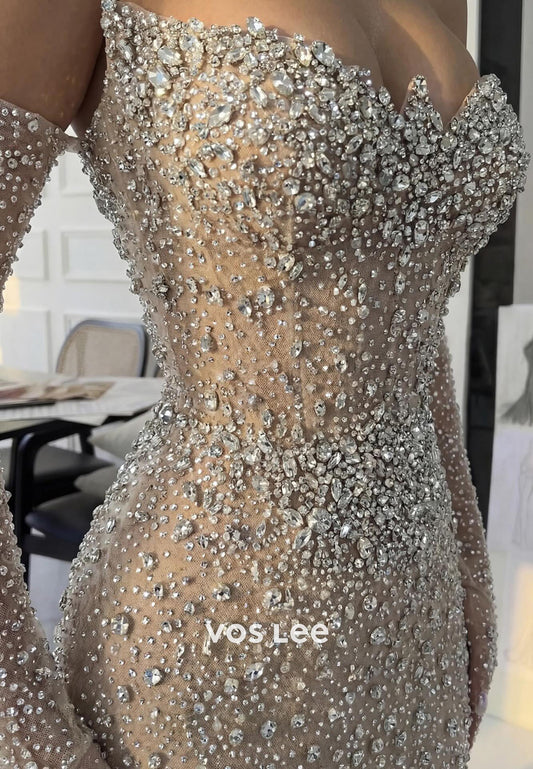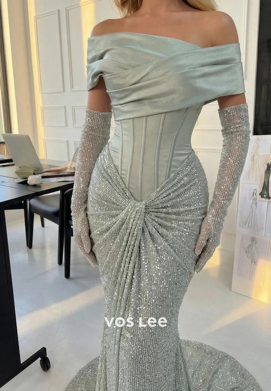 Off-the-Shoulder Sequins Mermaid Evening Gowns With Detachable Gloves