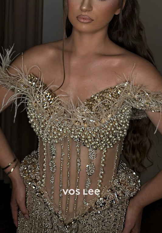 Luxury Sweetheart Fully Diamonds Mermaid Evening Dress Long Prom Dress With Feathers