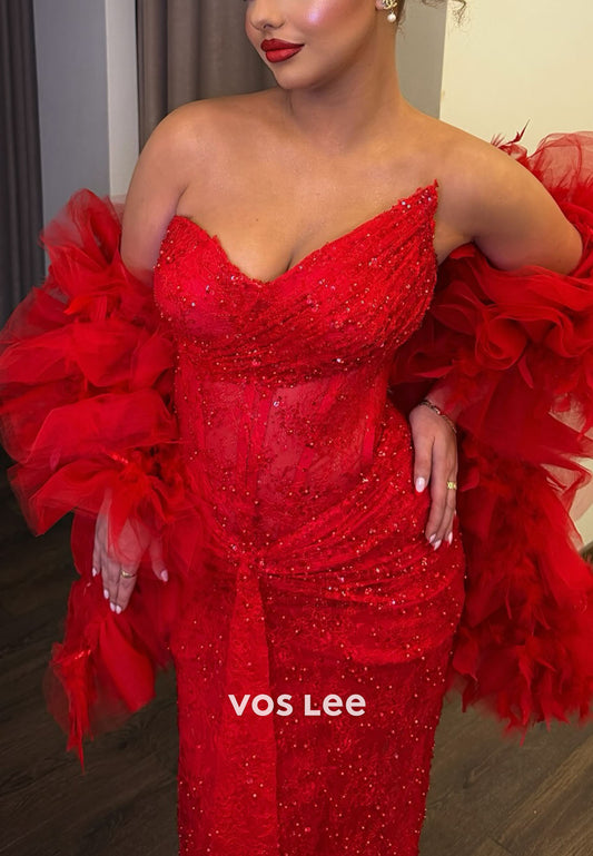 Strapless Mermaid Long Evening Dress With Pearls Pleats Ruffles