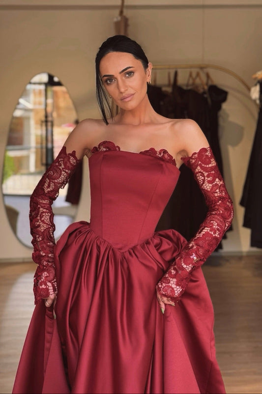 Elegant Burgundy Strapless Satin Mermaid Prom Dress Column Detachable Sleeves