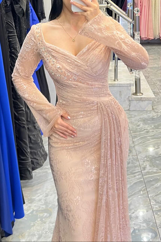 Blush Pink Lace Mermaid Gown | Long Sleeve Sparkly Crystals Evening Dress