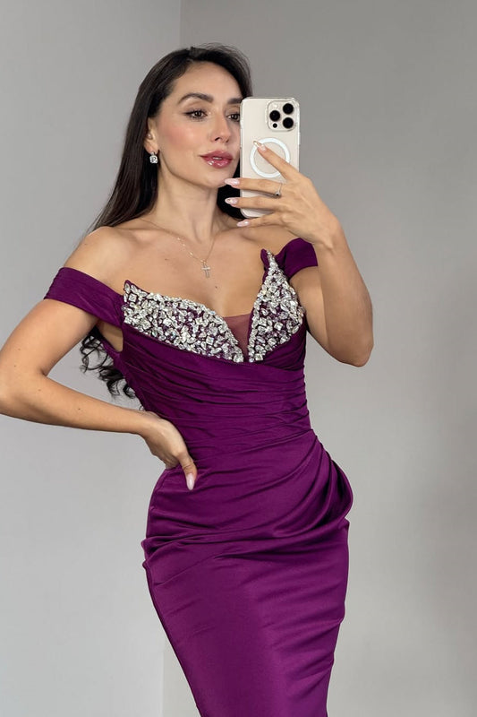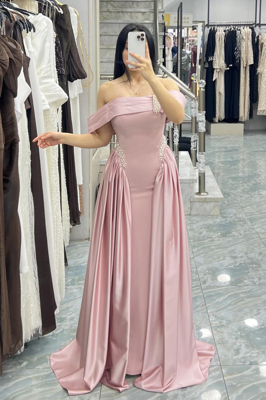 Luxury Bead Sweetheart Satin Prom Dress | Off Shoulder Bodycon Formal Gown