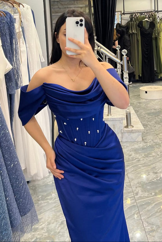 Royal Blue Off-The-Shoulder Satin Prom Dresses Pleats Sheath With Pearls