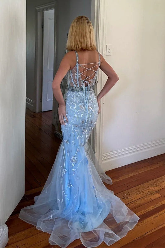 Elegant Spaghetti Strap Light Sky Blue Tulle Corset Back Evening Dresses Prom Dress