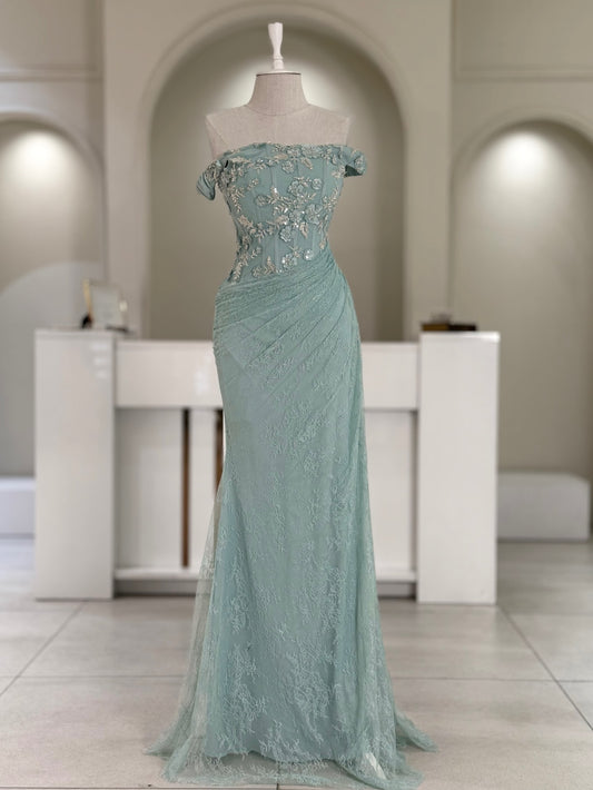 Blush Green Satin Ball Gown | Off-the-Shoulder Lace Appliqué Formal Dress