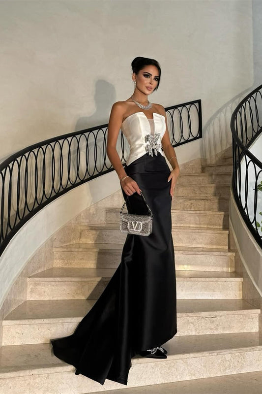 Glamorous White Black Satin Strapless Sleeveless Prom Dress Mermaid With Bow