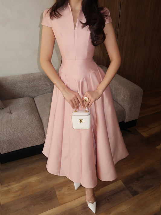 Blush Pink Satin Midi Dress | Cap Sleeve Fit and Flare Formal Gown