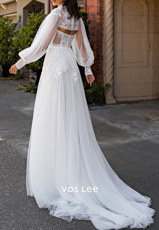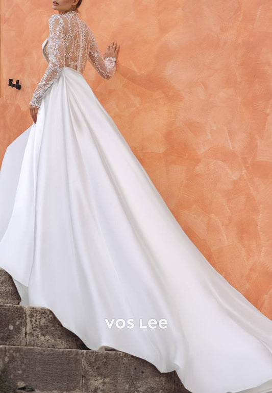 A-Line Illusion High Neck Long Sleeve Lace Sequins Wedding Dresses with Cathedral Train
