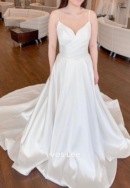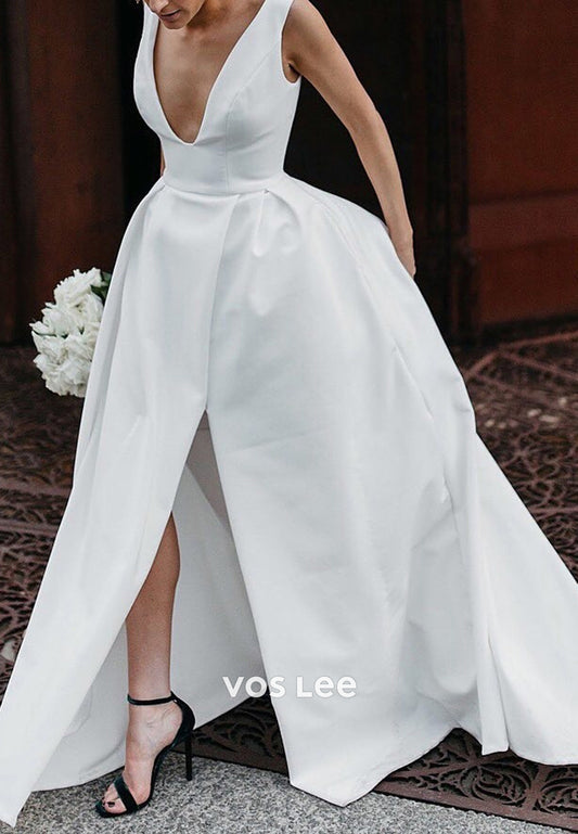 Classic & Timeless A-Line V Neck Split Pleated Satin Wedding Dresses with Chapel Train