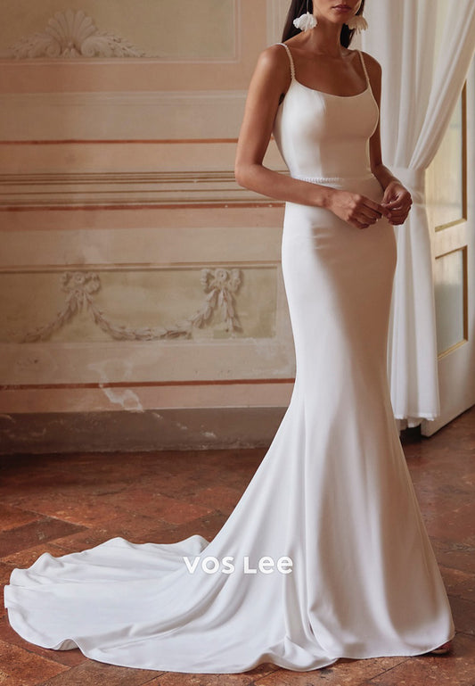 Sexy and Sleek Spaghetti Straps Square Sheath Wedding Dresses with Sweep Train