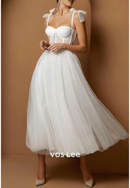 A-Line Spaghetti Straps Bowknot Sweetheart Pleated Simple Tea-Length Wedding Dresses