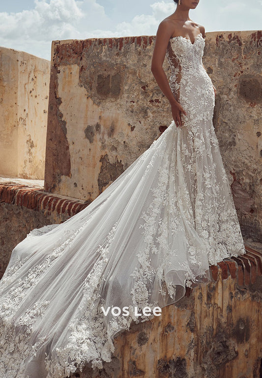Strapless Sweetheart Beaded Appliqued Mermaid Wedding Dresses with Court Train
