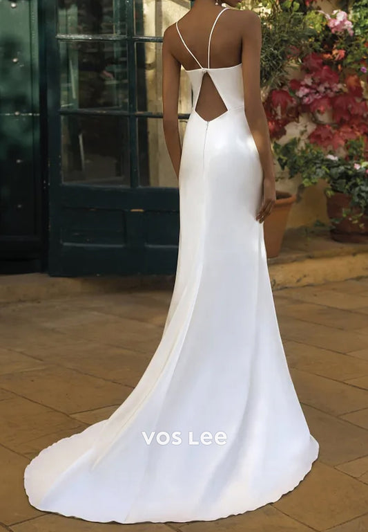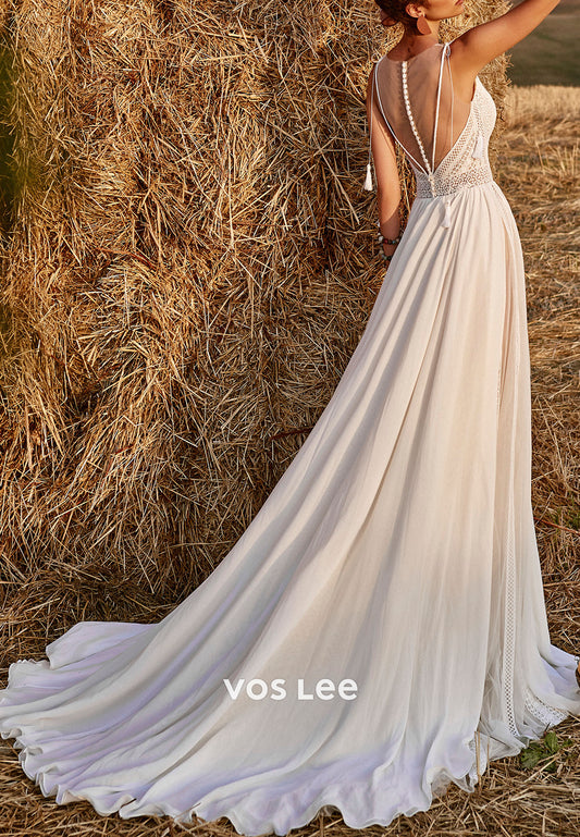Simple Spaghetti Straps V Neck Boho Wedding Dresses Maxi Dresses with Court Train